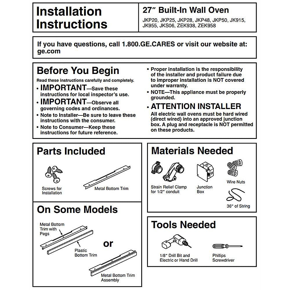 Left and right arrows move across top level links and expand close menus in sub levels. View and download ge jkp20 installation instructions manual online. Owner s manuals and installation instructions. 27 30 built in electric double wall oven.